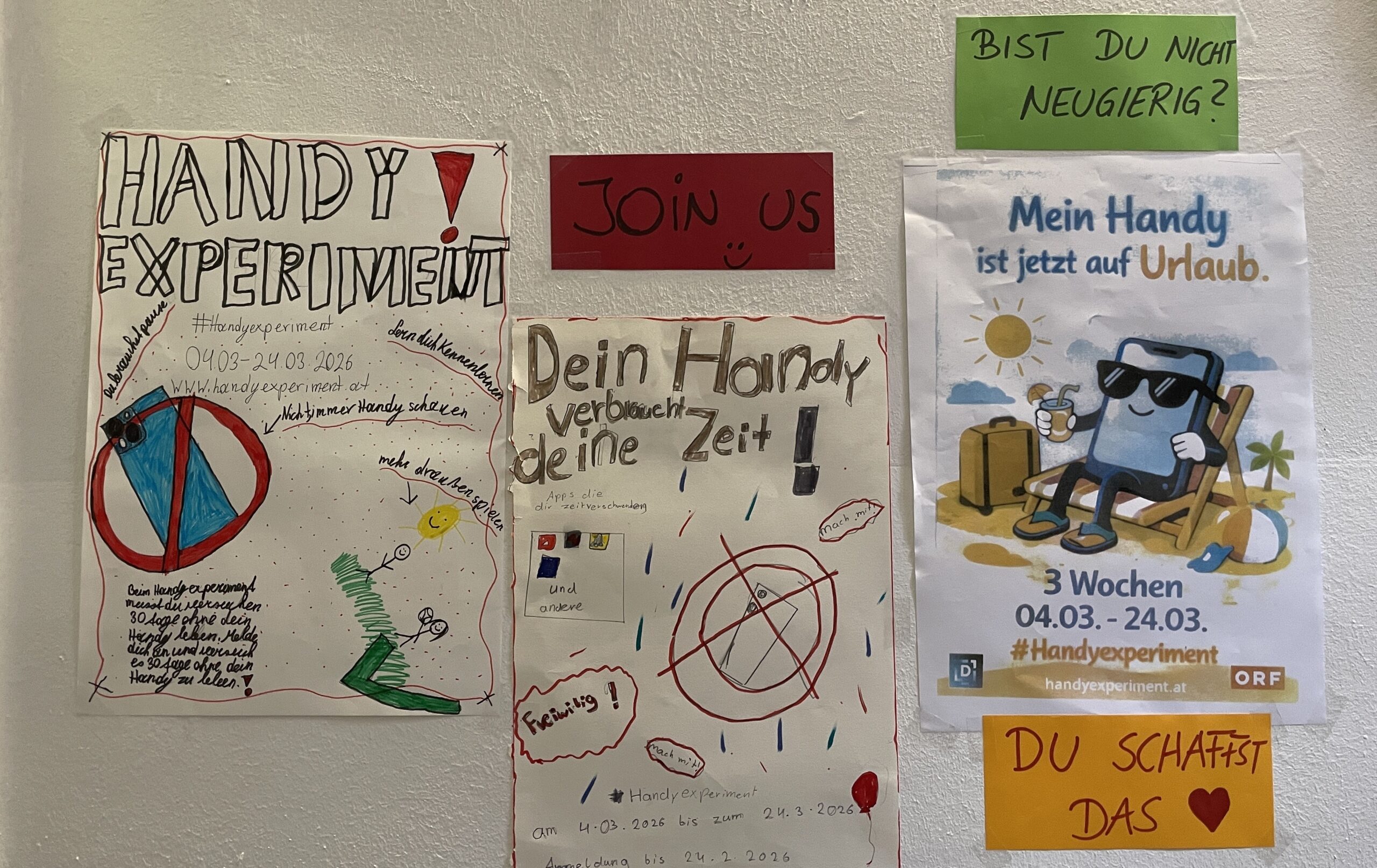 Vom 04.03. bis 24.03.2026 hat der ORF ein Handy-Experiment gemacht, bei dem ungefähr 62.000 Schüler:innen aus ganz Österreich mitgemacht haben. Dabei ging es darum, das Handy entweder ganz auszuschalten oder zumindest viel weniger zu benutzen. Auch unsere Schule war dabei. Wir aus der 1b haben die Herausforderung gemeinsam angenommen. Und die 6d mit Herrn Prof...
